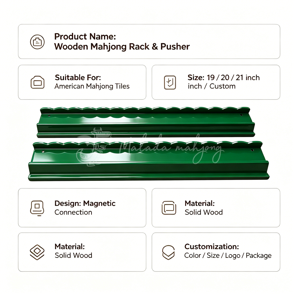 Elevate your mahjong game with our 20 Inch Wooden Mahjong Rack & Pusher Set, now available with 30+ vibrant colors and 6 wood stains and standard or scalloped pushers! Each set includes 4 racks & your choice of standard pushers or scalloped pushers with rack bag! Designed with stability in mind, the rack and pusher combination features 9 oversized magnets for added support. Your mahjong tiles deserve the perfect stage. Each set is presented in our signature MALADA-MAHJONG box, meticulously protected with anti-drop packaging for a flawless arrival.